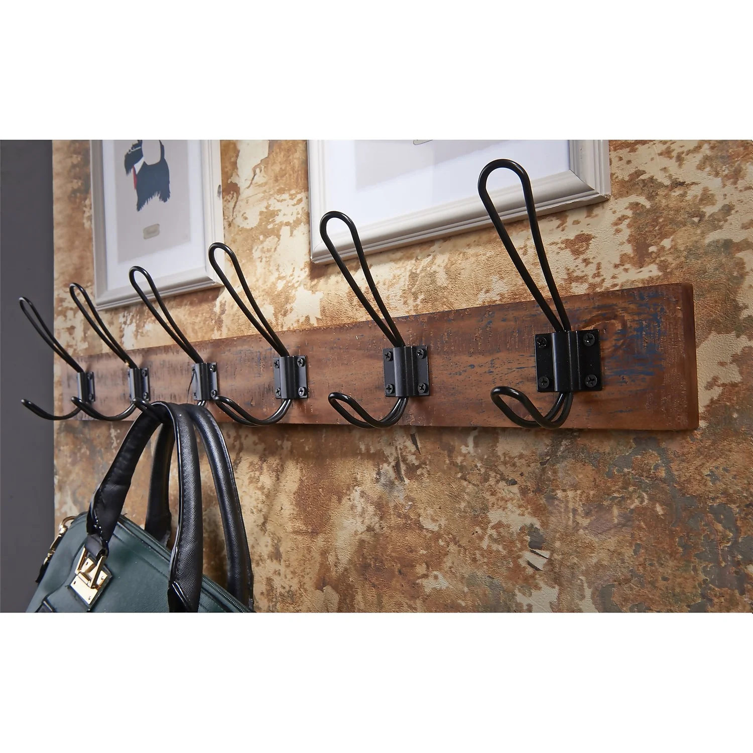 A rustic coat rail featuring 6 wire style black double hooks.