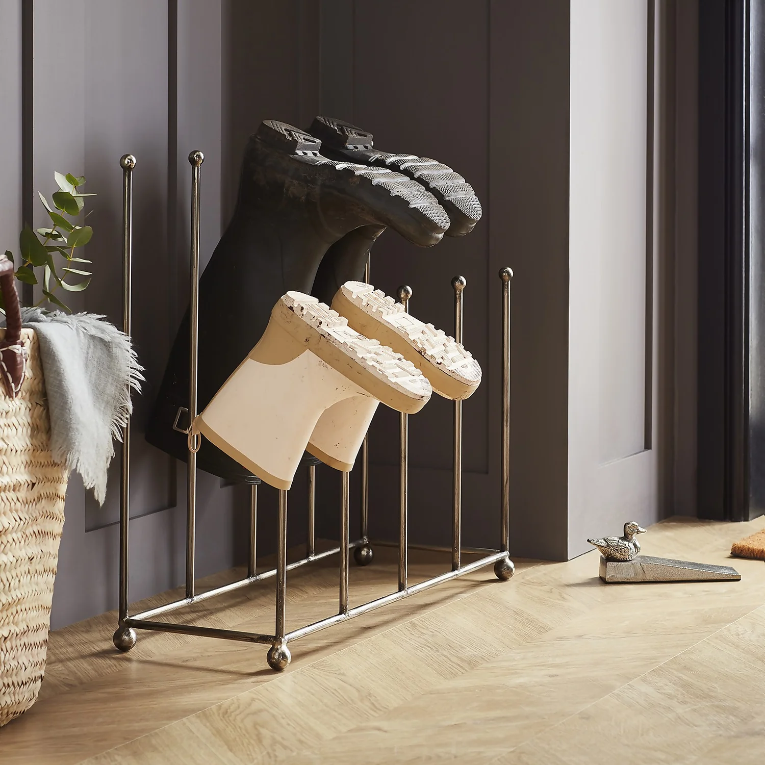 Iron material with pewter finish, A fantastic space saving way to store boots a sensible way of storing wet and dirty boots off the ground allowing them to dry.